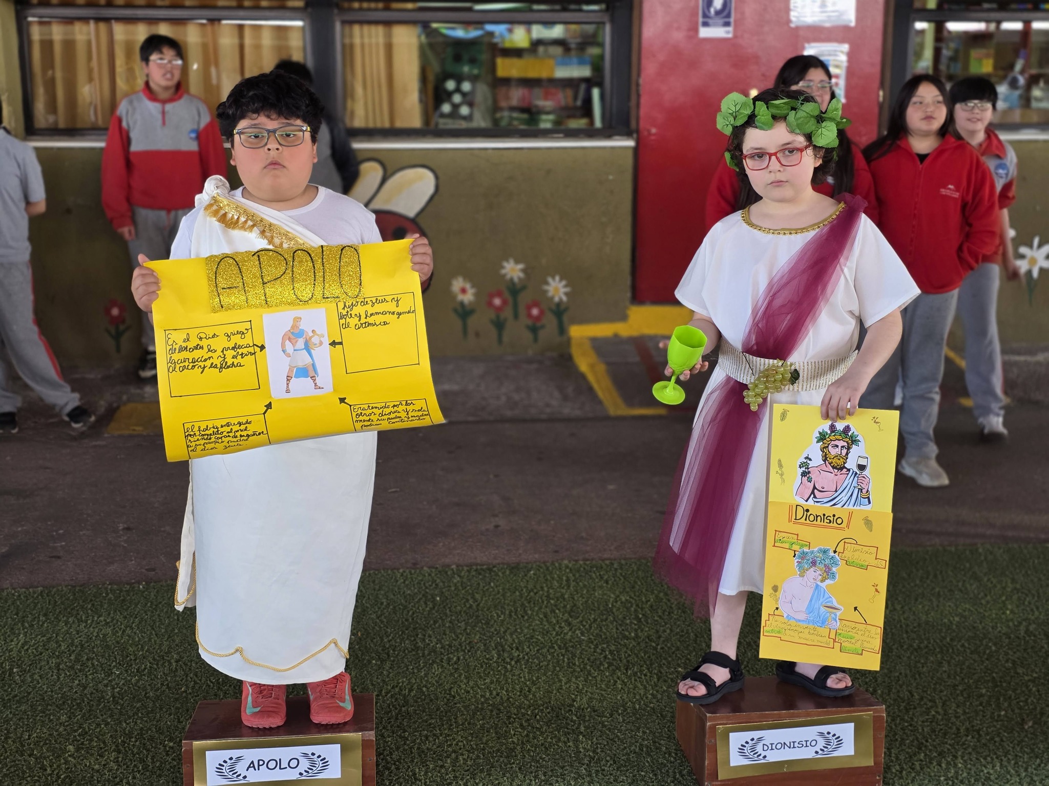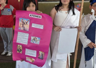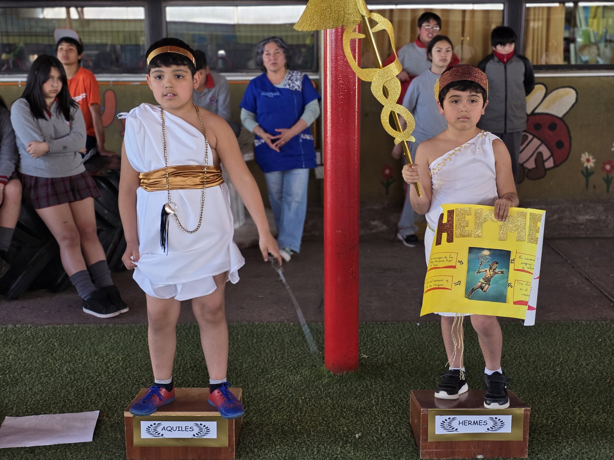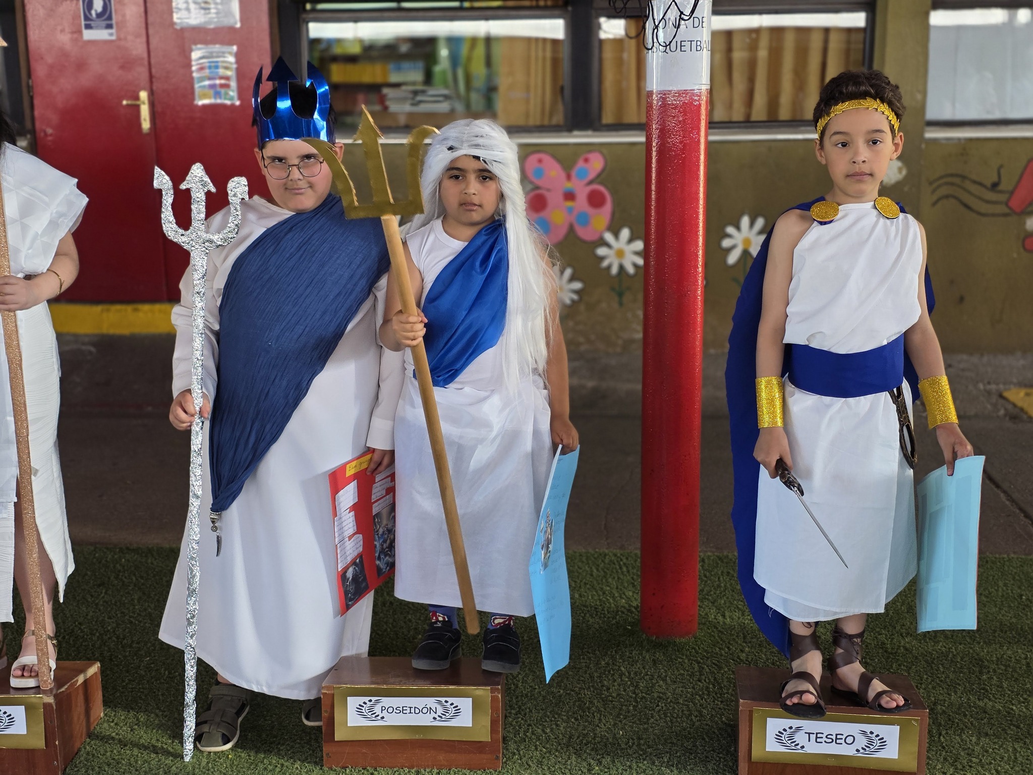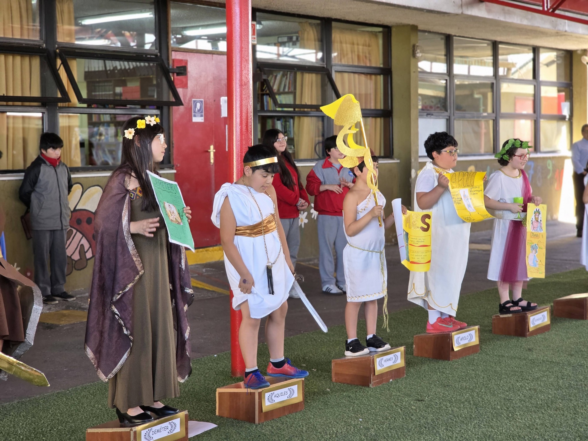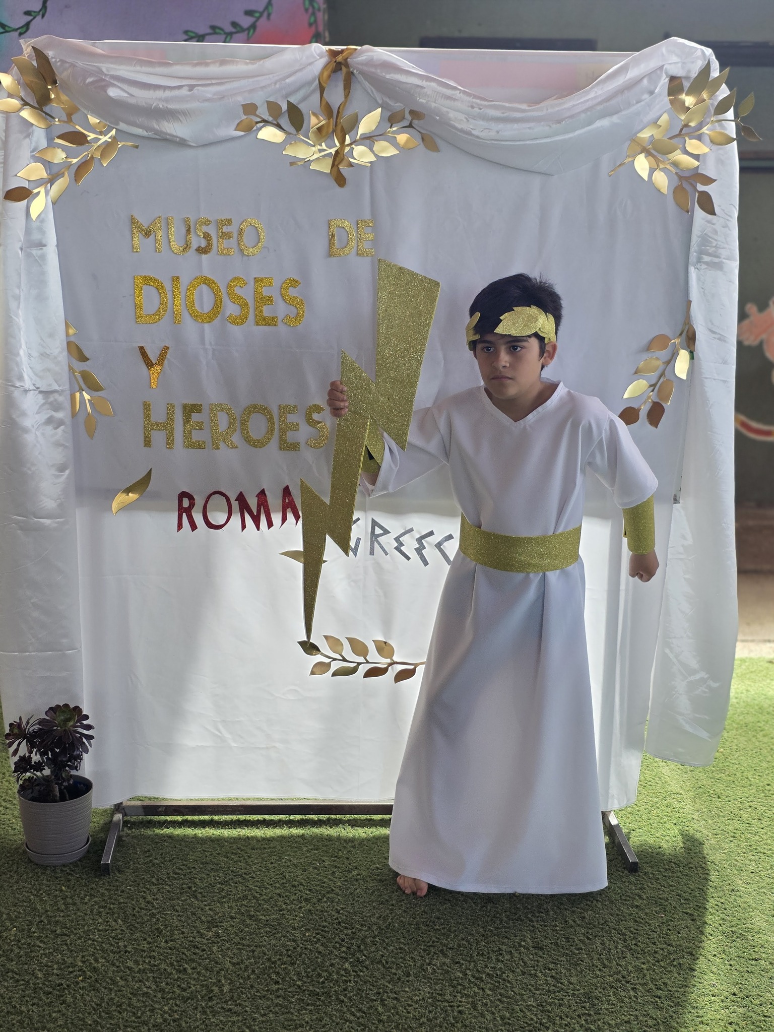 El jueves pasado y en el marco de la asignatura de Historia, Geografía y Ciencias Sociales, los cursos de 3°A y 3°B, representaron a los Dioses y Héroes de la cultura de Grecia y Roma. El patio techado se convirtió en una sala de Museo, donde los padres y apoderados pudieron visitar y conocer mas sobre estos personajes mitológicos. Del mismo modo, los cursos del I Ciclo pasaron visitando el museo y cada estudiante con su representación, pudo contar mas detalles del su personaje.